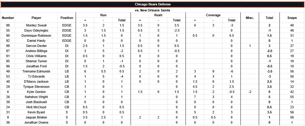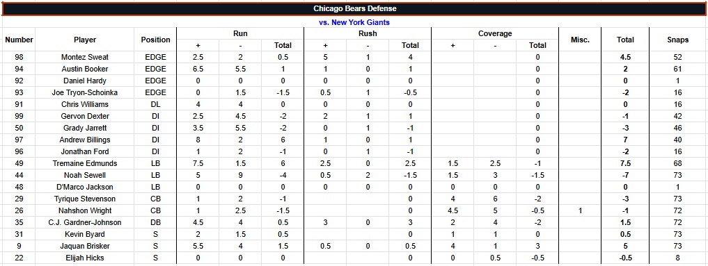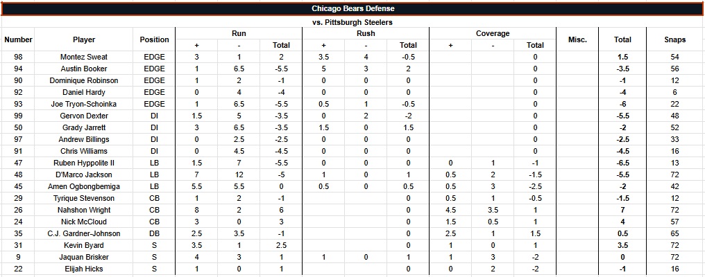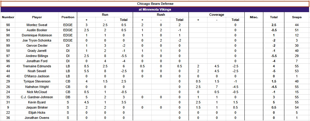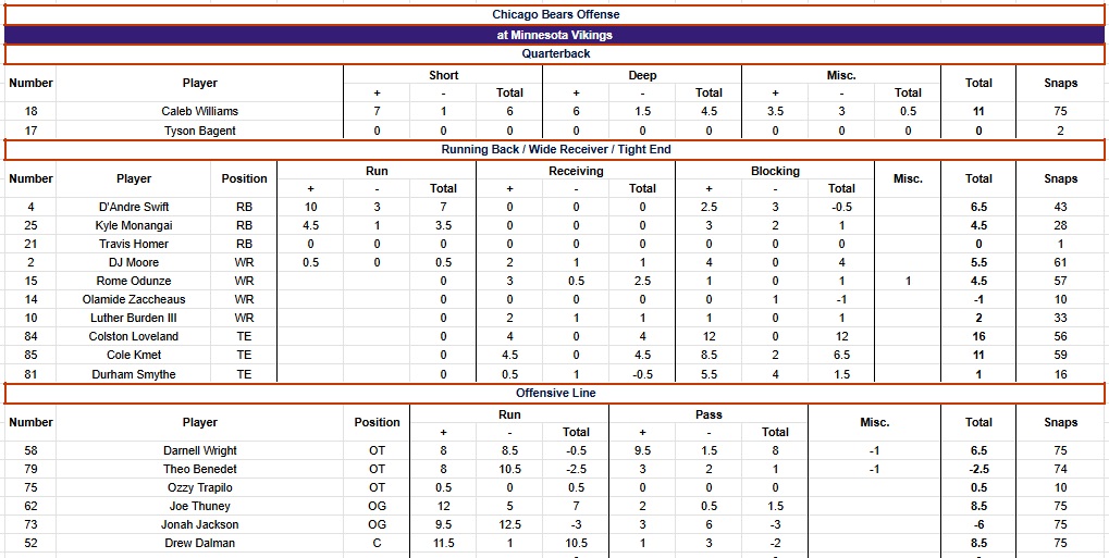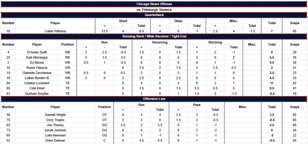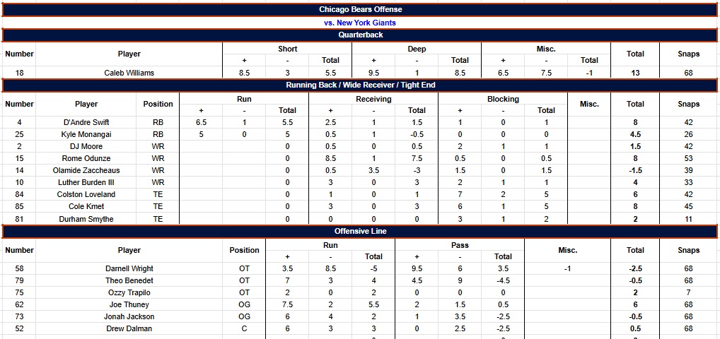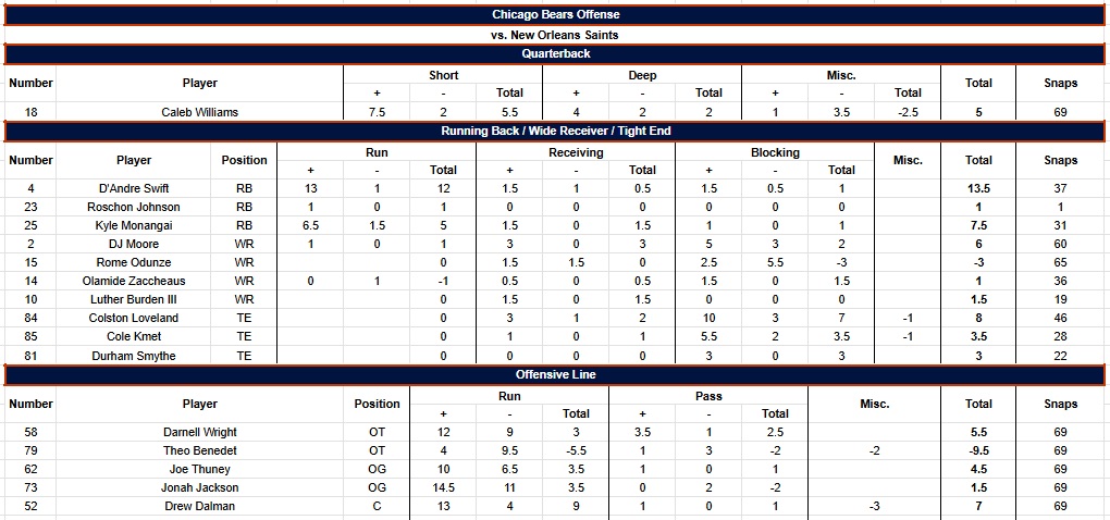 The grading scale goes from -2 to +2, in half-point increments, for each play. Screens are graded as runs. Penalties are counted in whatever phase they were committed. Pre- and post-snap penalties are in the “Misc.” column. “Short” throws are 15 yards or less, “Deep” is over 15. Everything else (scrambles, throwaways, reads, etc.) is under “Miscellaneous.” Parentheses in a column denote grades/snaps from the opposite side of the ball and are not included in grades/snaps from the player’s usual side. Snap counts are from Pro Football Reference. Box score and other relevant info can be found at that link as well.